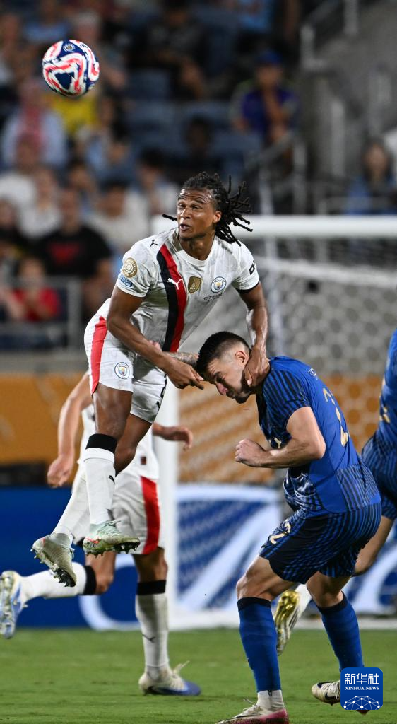 6月30日,曼彻斯特城队球员努内斯(上)在比赛中争顶。新华社记者 吴晓凌 摄