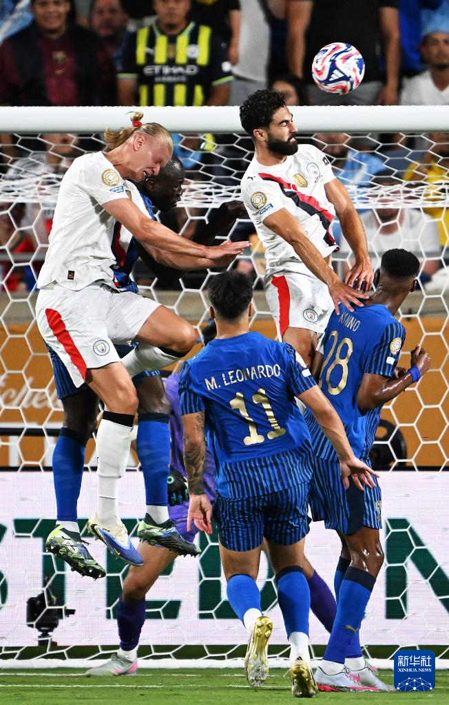 6月30日,曼城队球员哈兰德(上中)在比赛中争顶。新华社记者 许畅 摄