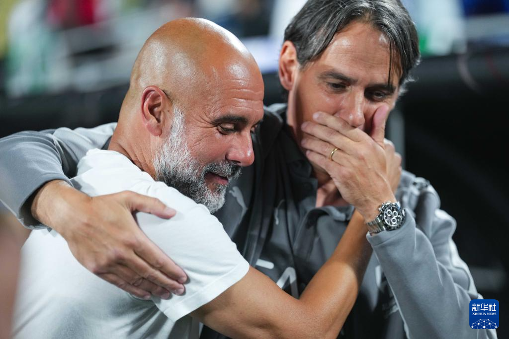 6月30日,曼城队主教练瓜迪奥拉(左)与利雅得新月队主教练西蒙尼·因扎吉在赛前拥抱致意。新华社记者 许畅 摄