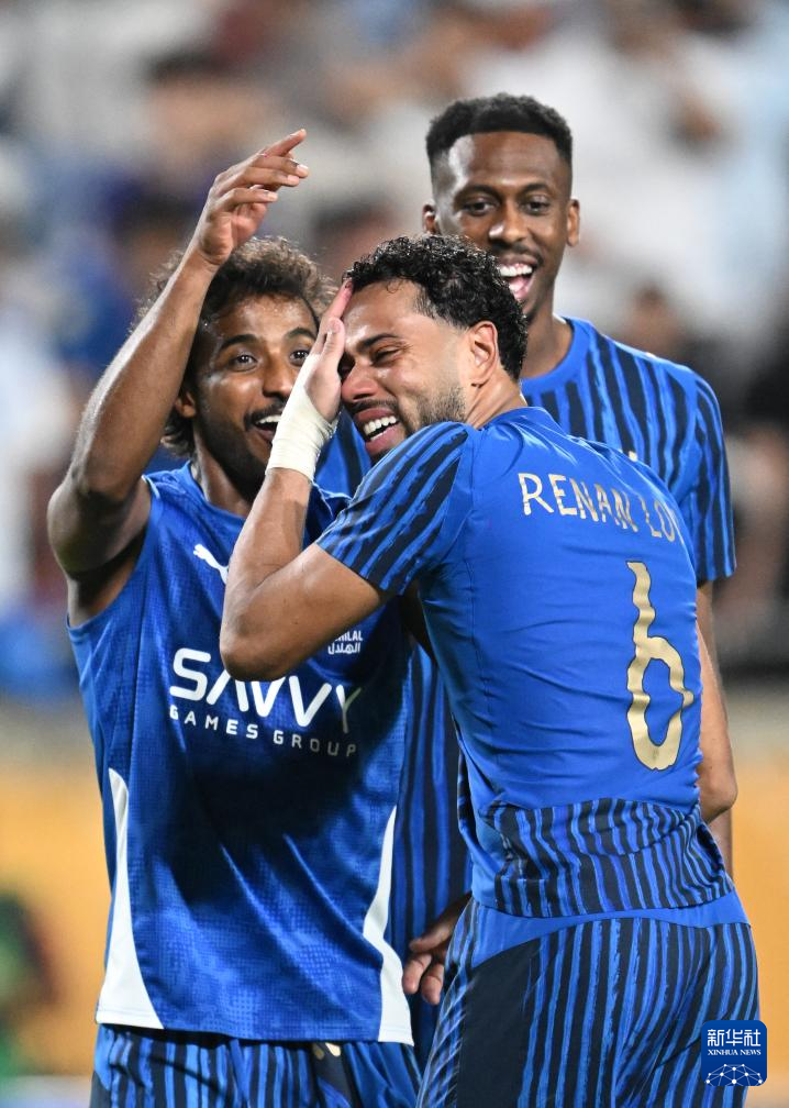 6月30日,利雅得新月队球员库利巴利(中)进球后庆祝。新华社记者 吴晓凌 摄
