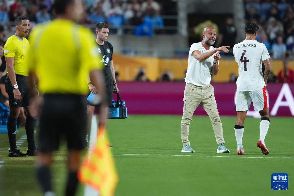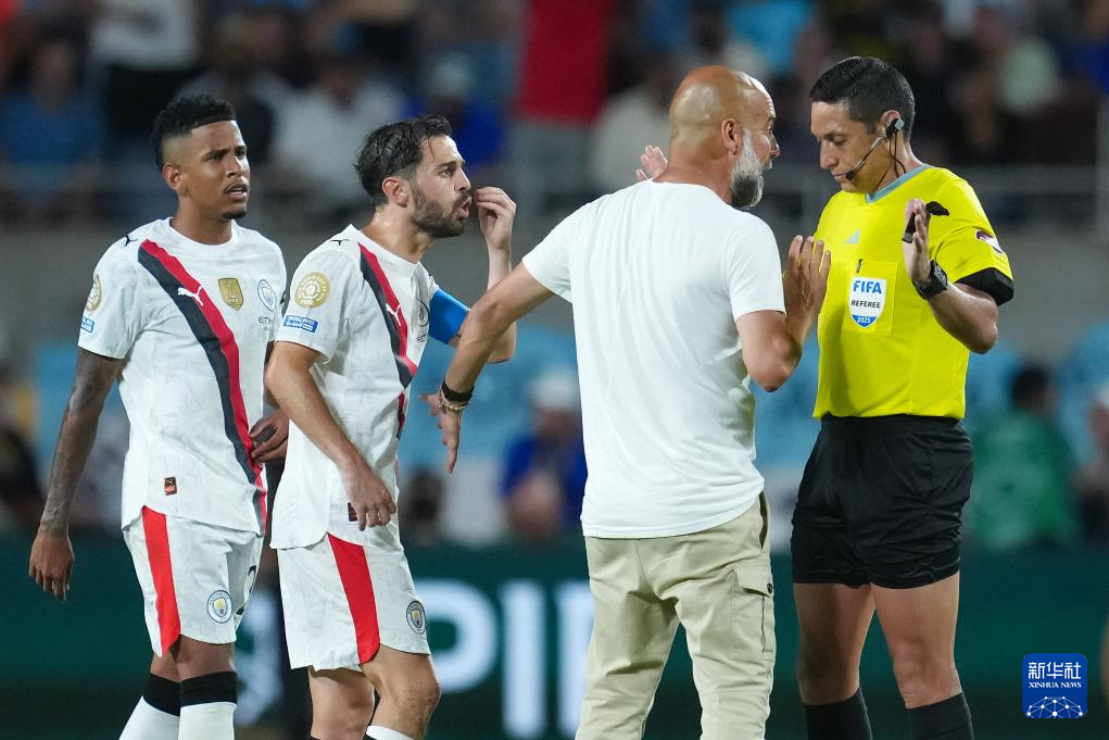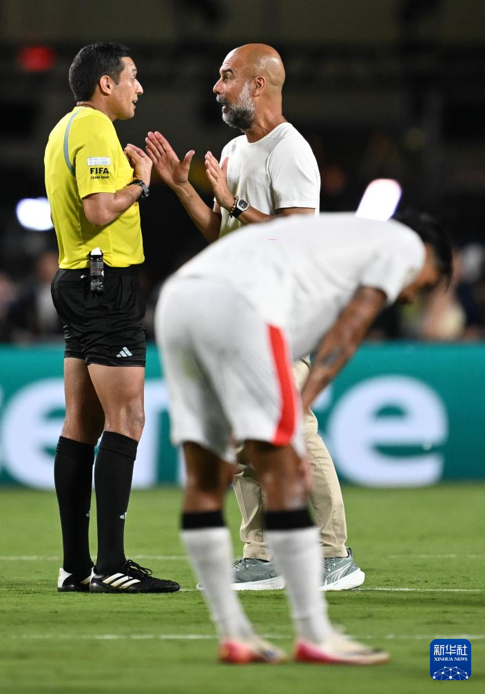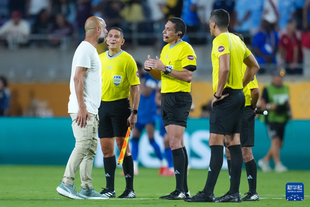 6月30日,曼城队主教练瓜迪奥拉(右二)在比赛中与裁判沟通。新华社记者 许畅 摄