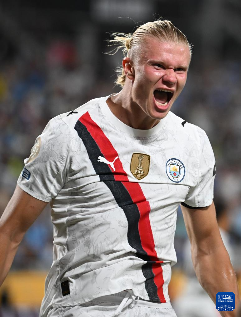 6月30日,曼彻斯特城队球员哈兰德在进球后庆祝。新华社记者 吴晓凌 摄