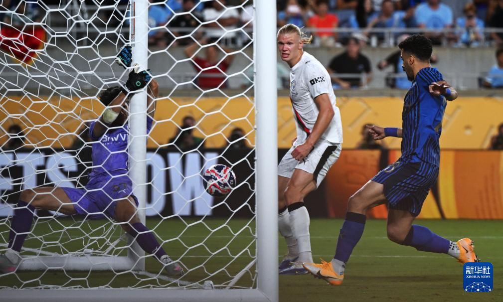 6月30日,曼彻斯特城队球员哈兰德(右二)在禁区内射门得分。新华社记者 吴晓凌 摄