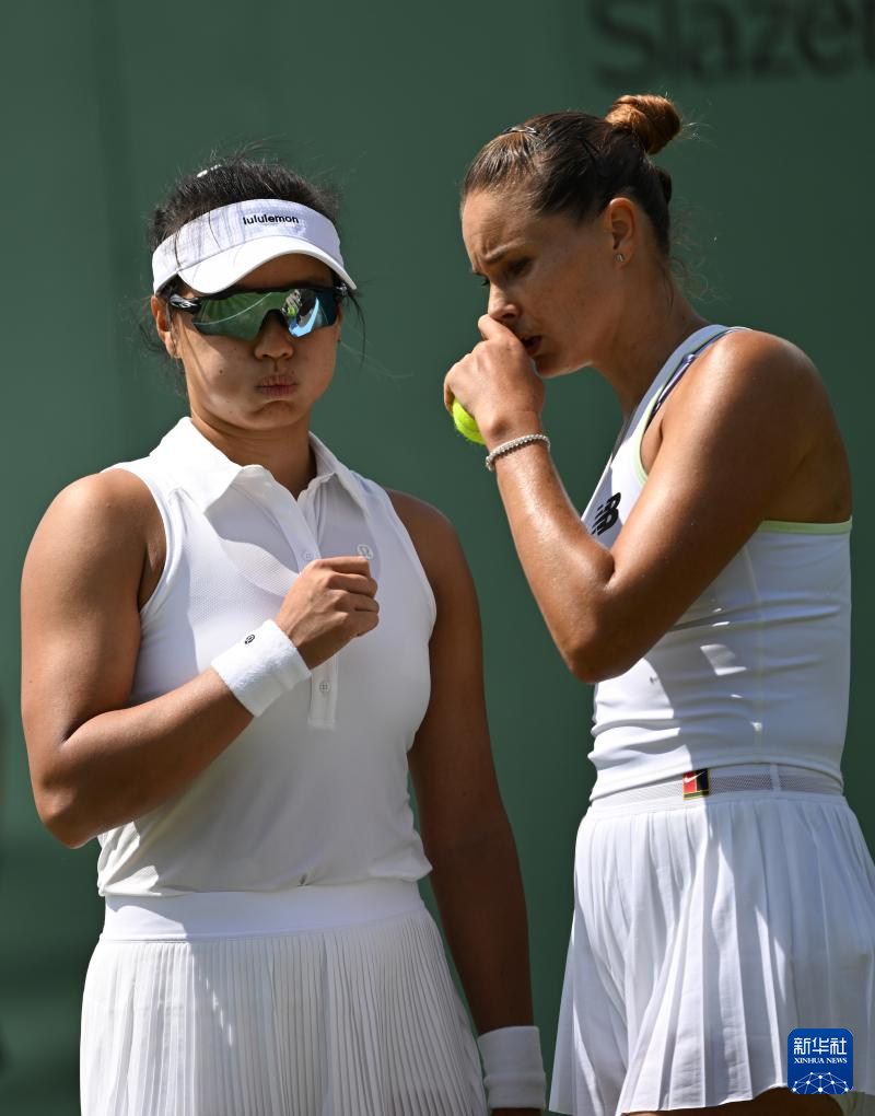 7月3日,郭涵煜(左)/帕诺娃在比赛中交流。新华社记者 李颖 摄