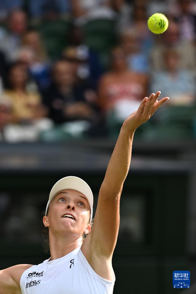 7月3日,斯维亚特克在比赛中发球。新华社记者 赵丁喆 摄