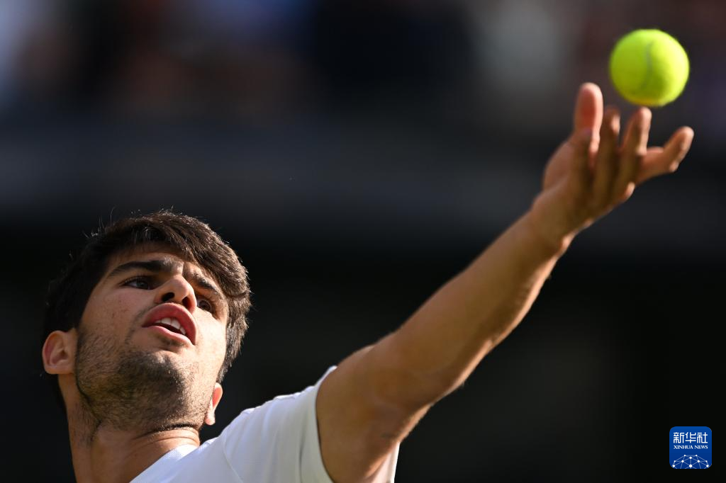 7月4日,阿尔卡拉斯在比赛中发球。新华社记者 赵丁喆 摄