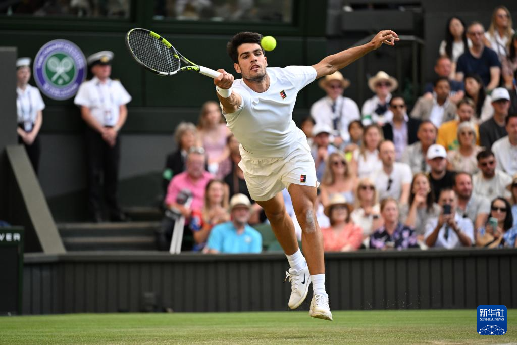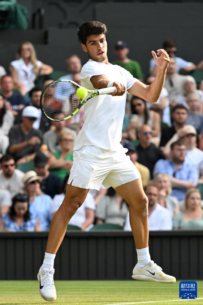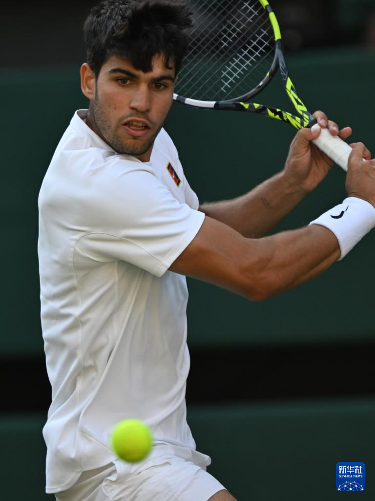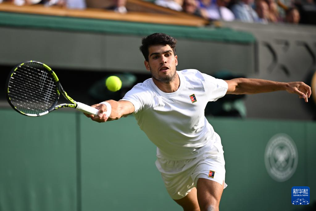 7月4日,阿尔卡拉斯在比赛中回球。新华社记者 赵丁喆 摄