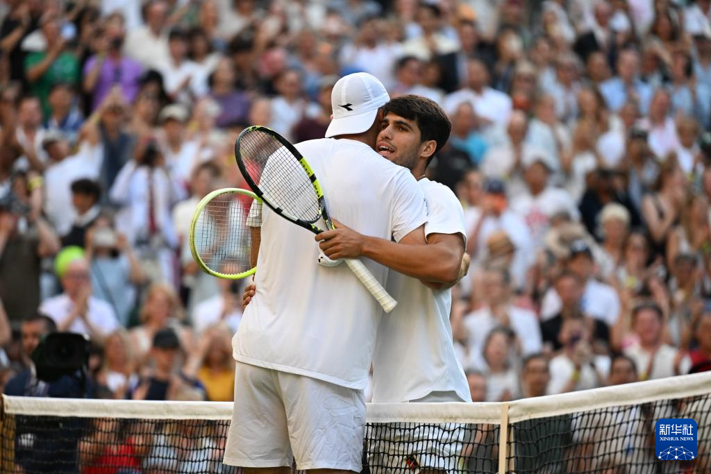 7月4日,阿尔卡拉斯(右)在比赛后与施特鲁夫拥抱致意。新华社记者 赵丁喆 摄