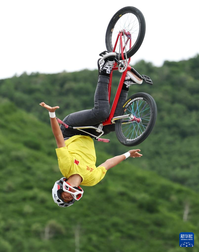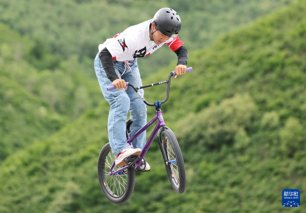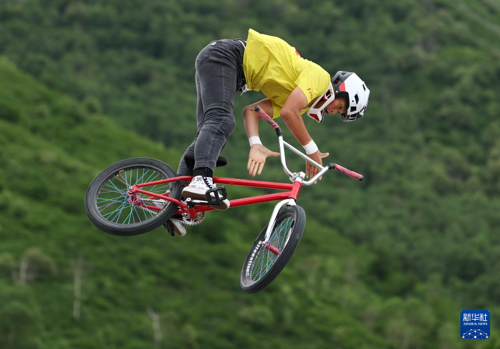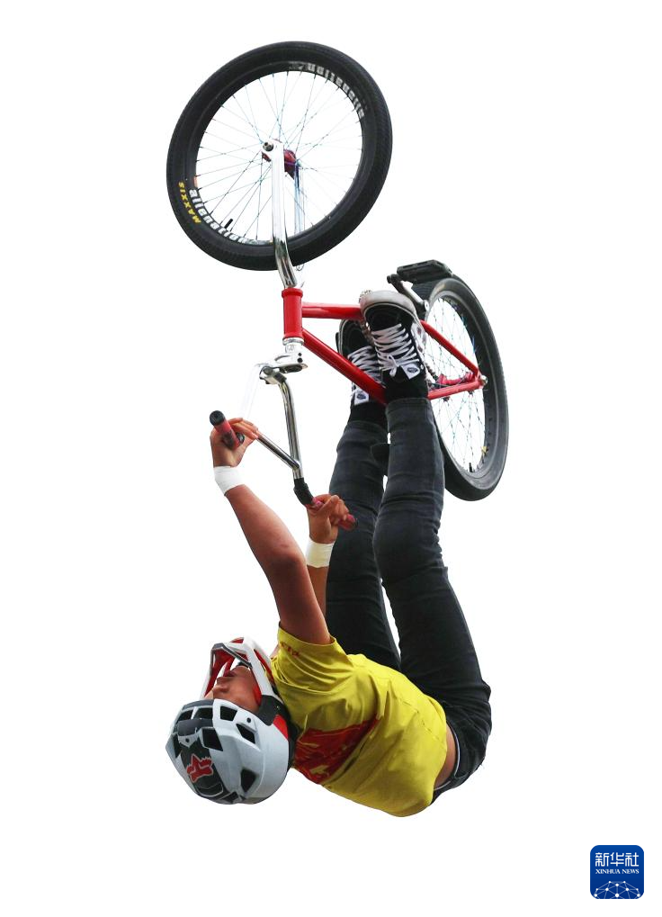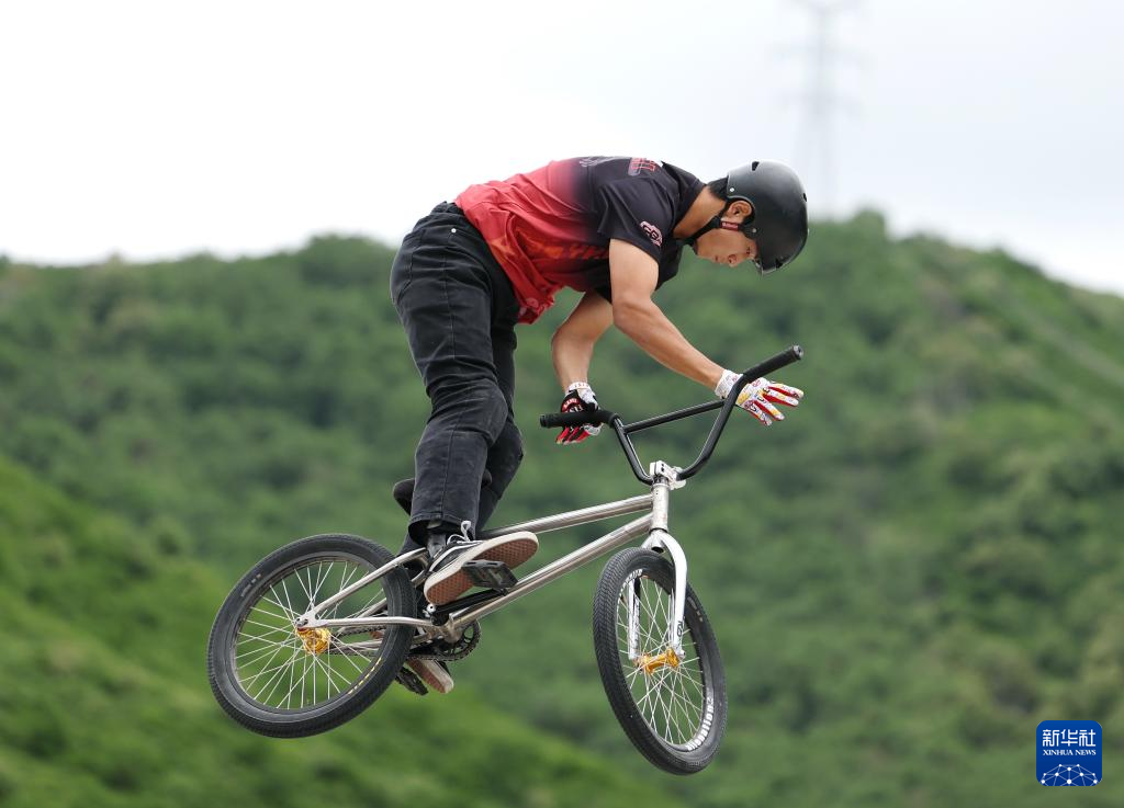 7月5日,安徽BMX自由式小轮车队选手刘星在精英男子组资格赛第一轮比赛中。最终,他晋级下一轮。新华社发(武殿森摄)