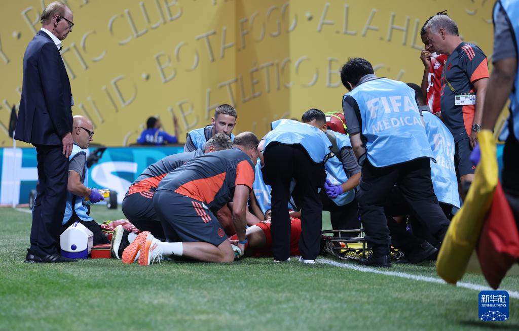 7月5日,医护人员在场边查看拜仁慕尼黑队球员穆西亚拉伤势。