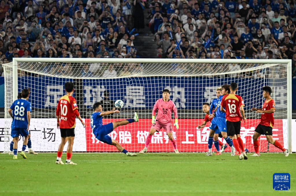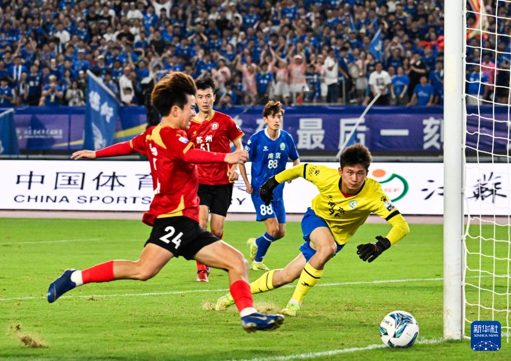 7月5日,南京队门将郑豪(右一)在比赛中封堵苏州队球员寇程(左一)的射门。