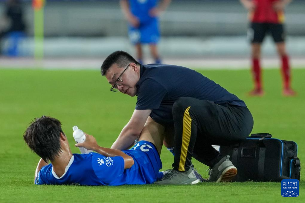 7月5日,南京队队医为球员司俊琰(下)进行治疗。