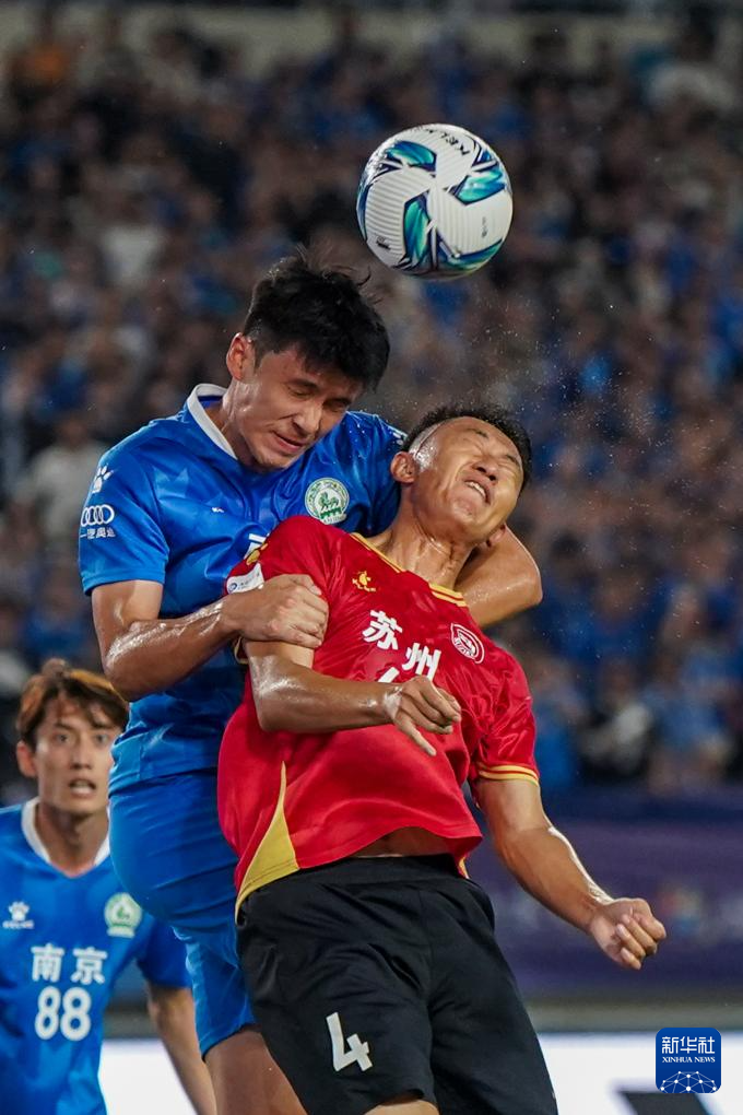 7月5日,苏州队球员邢序飞(前)在比赛中与南京队球员李加俊争顶。