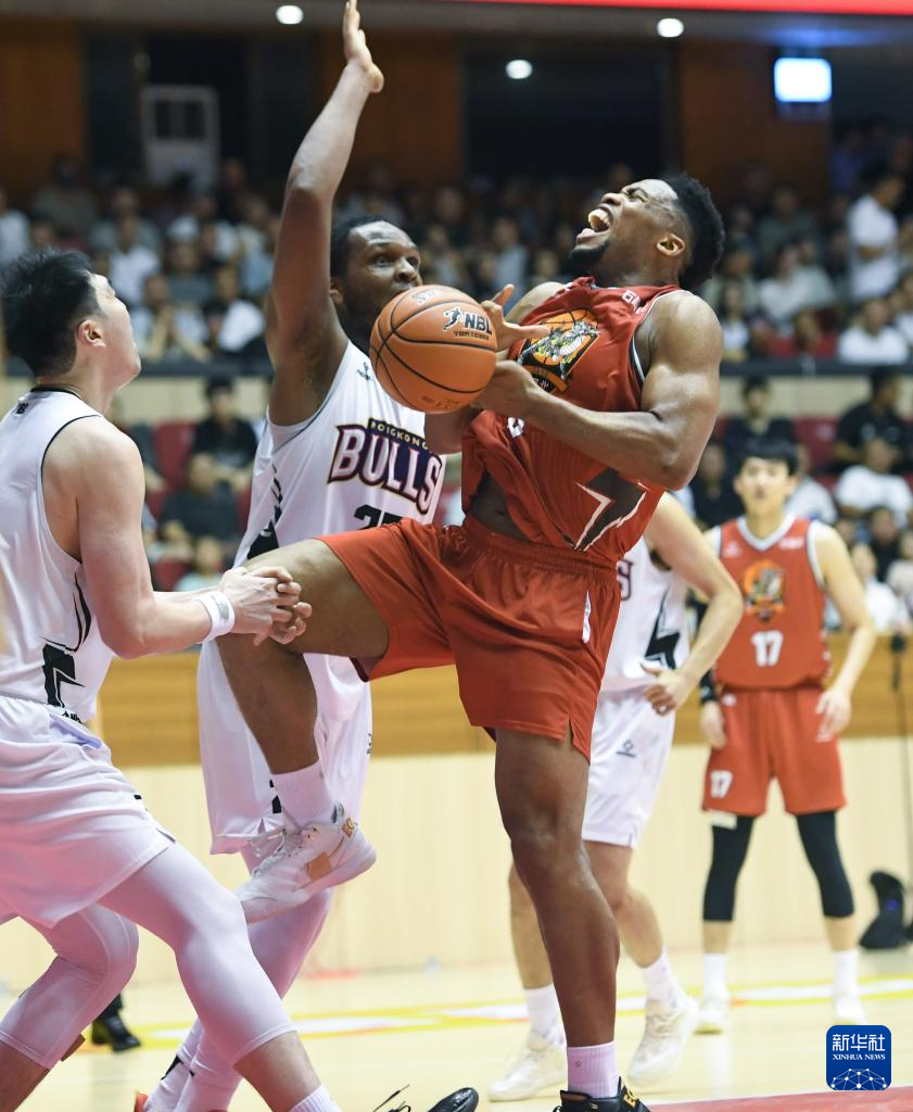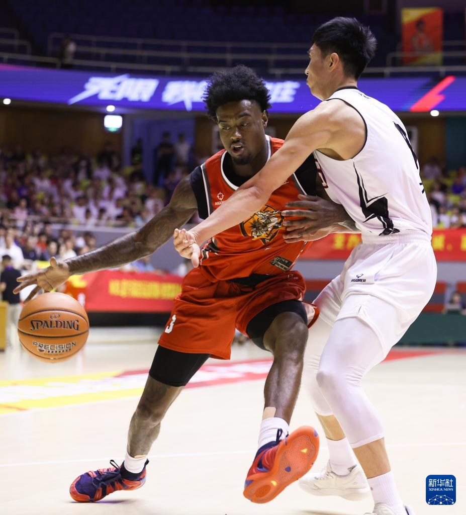 7月6日,石家庄翔蓝队球员阿诺斯克(右)在比赛中上篮受阻。新华社发(张晓峰摄)
