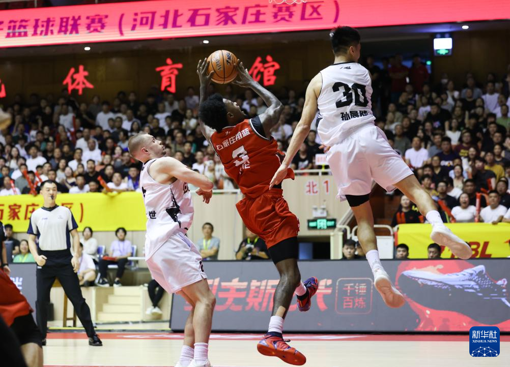 7月6日,石家庄翔蓝队球员沃伦(中)在比赛中突破上篮。新华社发(梁子栋摄)