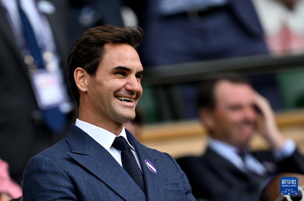 7月7日,费德勒在看台为获胜的焦科维奇获起身鼓掌。新华社记者 李颖 摄