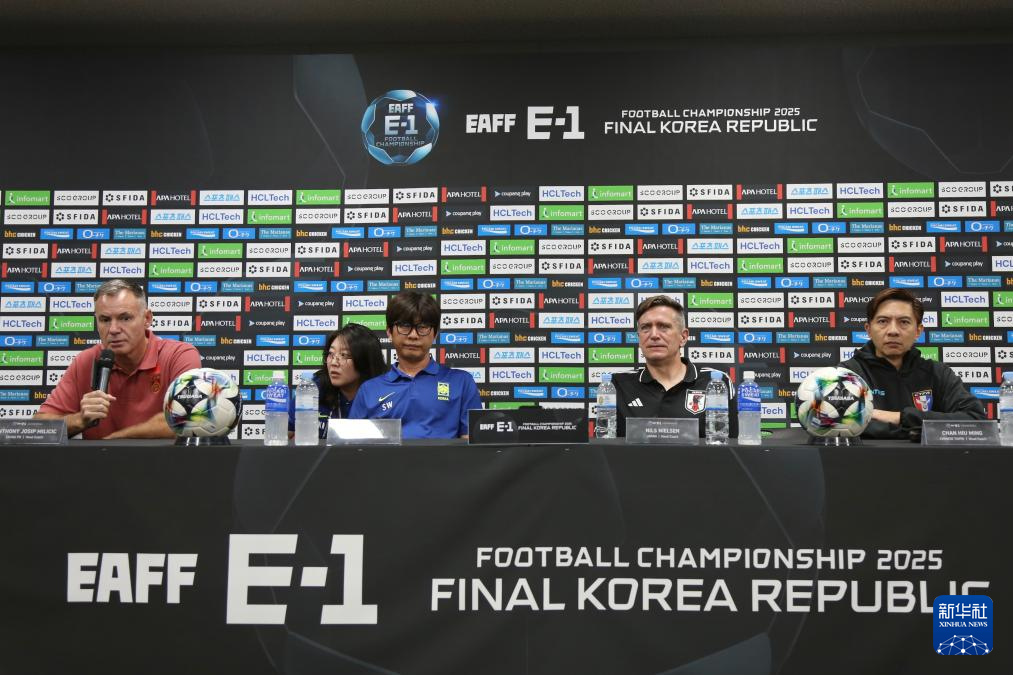 7月8日,中国队主教练安特·米利西奇、韩国队主教练申相又、日本队主教练尼尔森、中国台北队主教练陈晓明(从左至右)出席新闻发布会。新华社记者 黄昕欣 摄