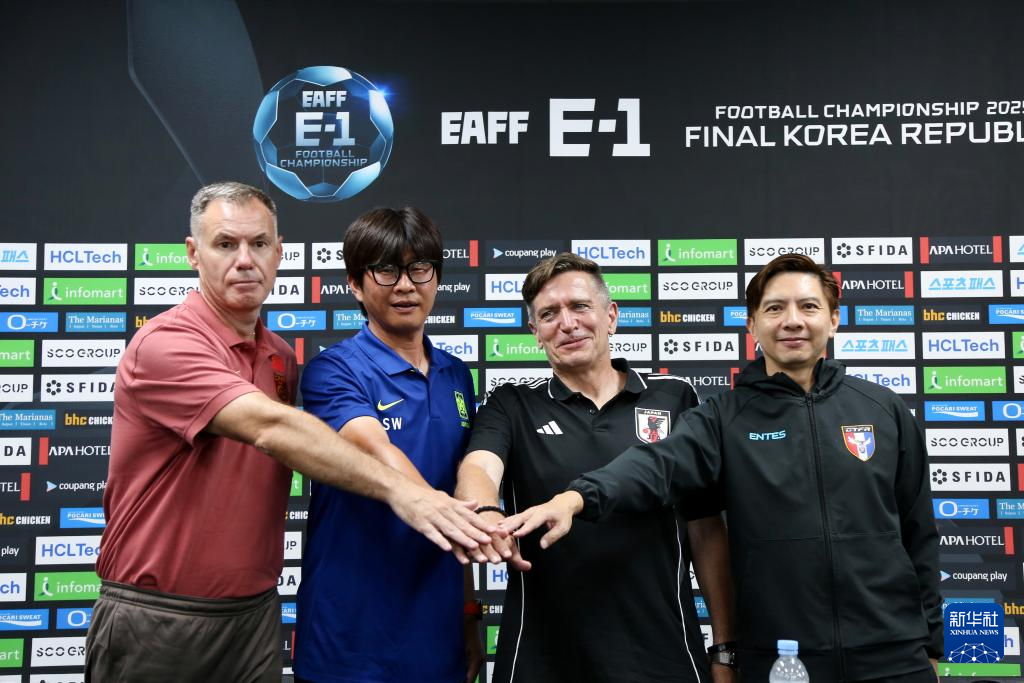 7月8日,中国队主教练安特·米利西奇、韩国队主教练申相又、日本队主教练尼尔森、中国台北队主教练陈晓明(从左至右)在新闻发布会上合影。新华社记者 黄昕欣 摄