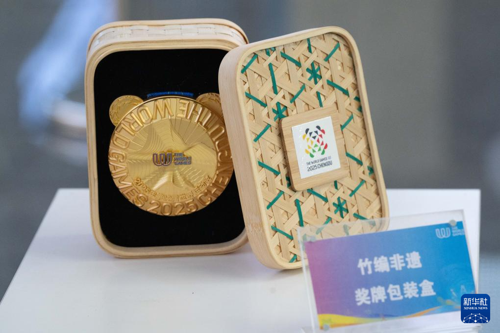 这是7月8日拍摄的成都世运会奖牌包装盒。包装盒采用非遗竹编技艺手工编织,外形“方圆周正”。新华社发(陈居伟摄)