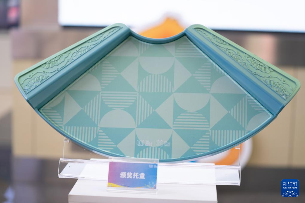 这是7月8日拍摄的成都世运会颁奖托盘。颁奖托盘整体为圆润流畅的扇形,握柄处浮雕太阳神鸟振翅纹与芙蓉盛放图,二者交融,诠释“金乌负日、花重锦官”的时空对话。新华社发(陈居伟摄)