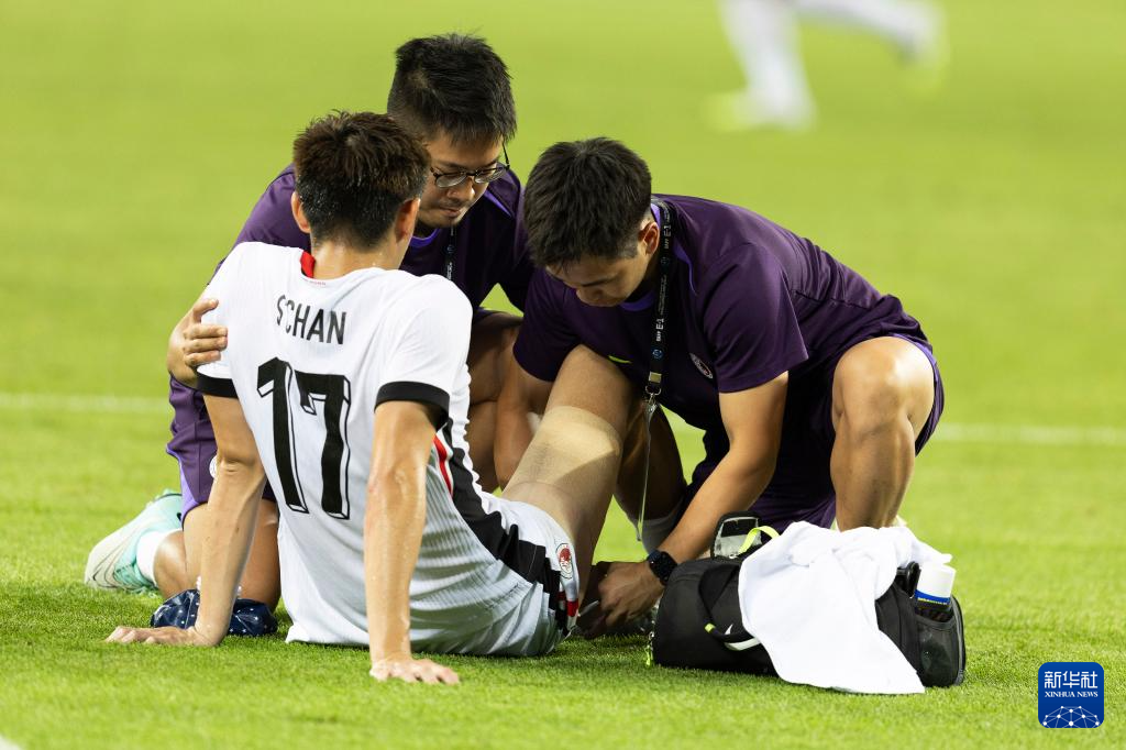7月8日,中国香港队球员陈晋一在比赛中受伤。新华社发(全休相摄)