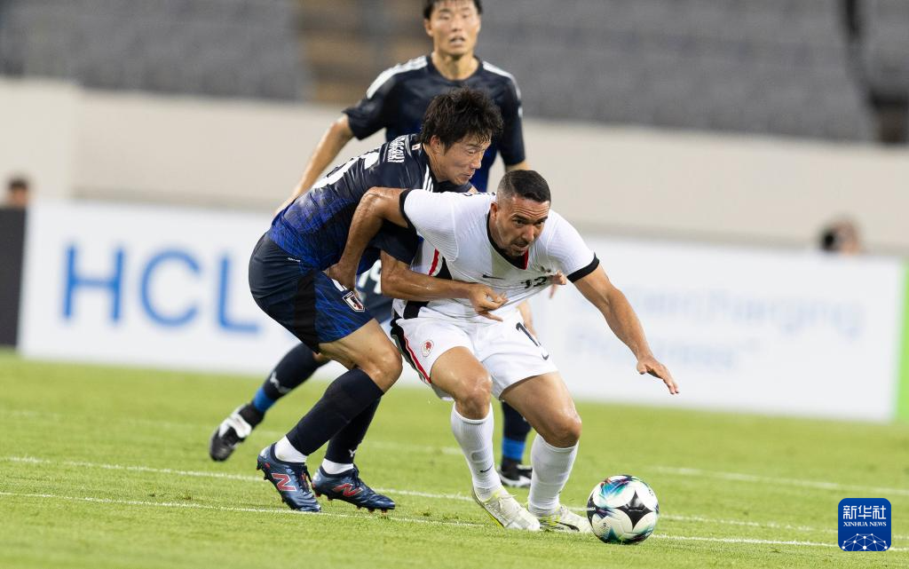 7月8日,中国香港队球员艾华(前)与日本队球员古贺太阳在比赛中拼抢。新华社发(全休相摄)