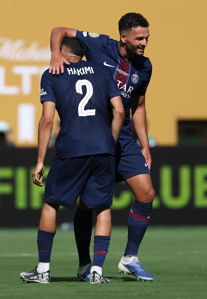 巴黎圣日耳曼队球员贡萨洛·拉莫斯(右)打入球队第四粒进球后与队友阿什拉夫·哈基米庆祝。新华社记者 李明 摄