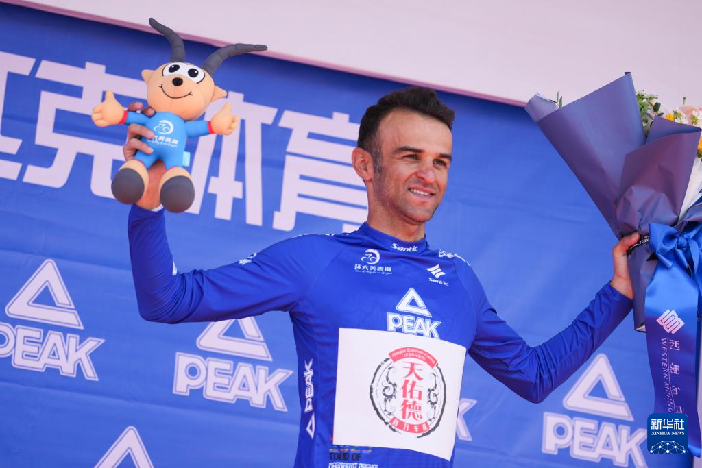 7月9日,青海天佑德车队车手赛伊德·萨法扎德身着代表亚洲最佳车手的蓝衫在领奖台上。新华社记者 齐芷玥 摄