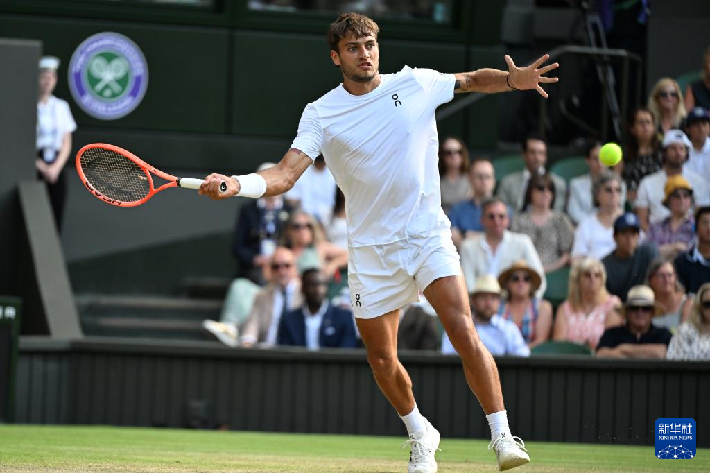 7月9日,焦科维奇在比赛中回球。新华社记者 赵丁喆 摄