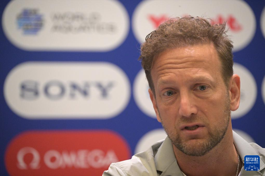 7月10日,世界泳联执行官布伦特·诺维茨基出席赛前新闻发布会。新华社发(邓智炜摄)