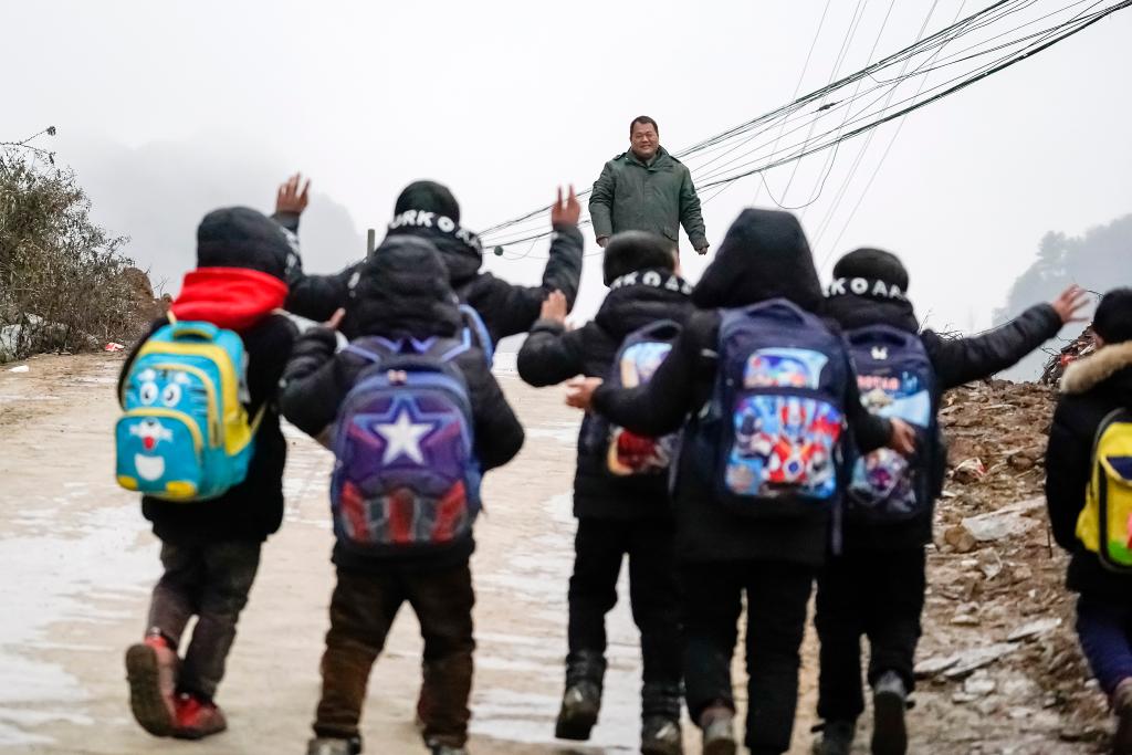 徐召伟(后)在迎接学生上学(2019年1月4日摄)。新华社记者 沈伯韩 摄