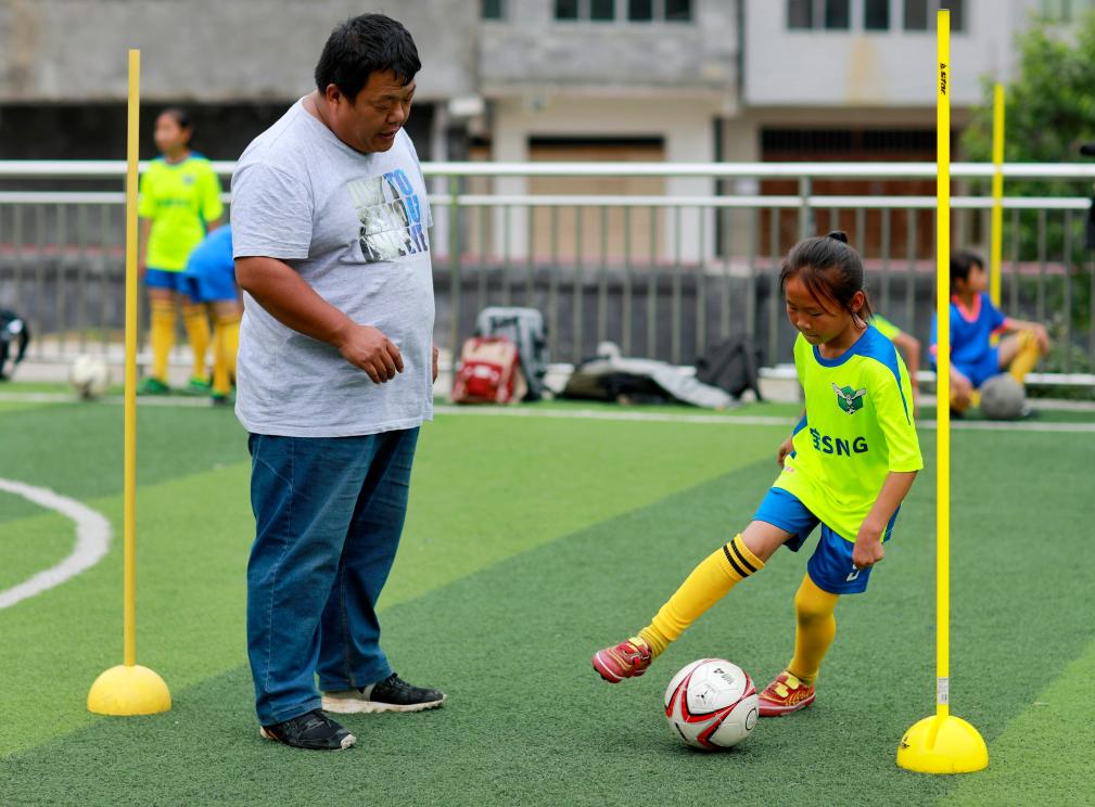 徐召伟(左)在指导元宝小学足球队队员练习(2019年5月29日摄)。新华社记者 欧东衢 摄