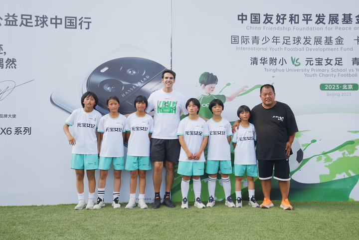 元宝女足队员与著名球星卡卡(左四)合影。受访者供图