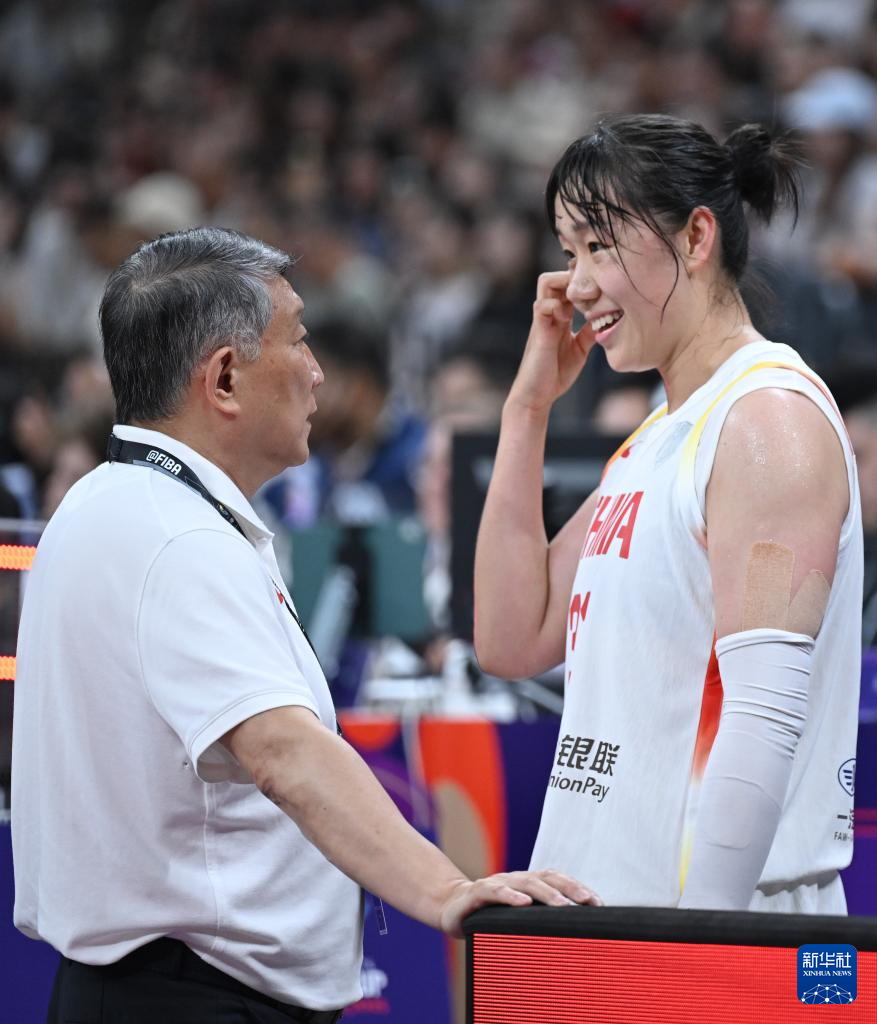 7月13日,中国队主教练宫鲁鸣(左)在比赛间隙与队员贾赛琪交流。