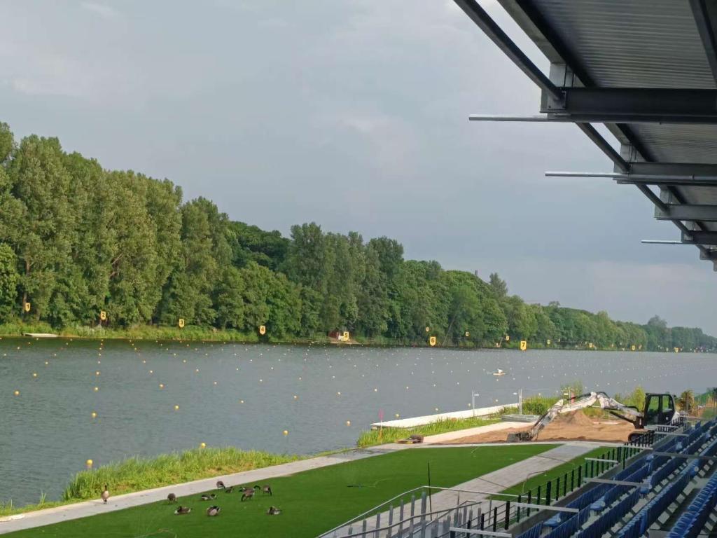 赛艇场地入口处,工人正忙着从车上卸载水泥,入口一侧成排的卫生间十分醒目。当有记者尝试使用卫生间时,发现门是锁着的,工作人员解释说还没有投入使用。赛艇场地内部水道两侧空无一人,一群灰雁在岸边悠闲地啃食着青草,草坪两端有两块黄土裸露的空地,空地上停放着钩机,目前场地平整工作没有完成。