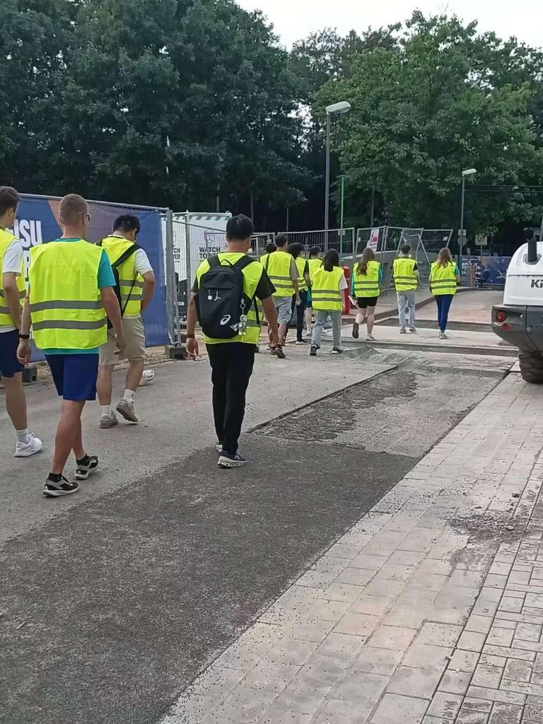 之后,媒体人员乘坐约20分钟的大巴抵达杜伊斯堡。杜伊斯堡是本次大运会的主场馆绍因斯兰旅游竞技场所在地,主场馆周围分布着赛艇、水球和沙排比赛场地。水球比赛是露天场地,由一个露天游泳池改造而成,泳池被分成两部分,男女各一支队伍正在进行赛前训练。
