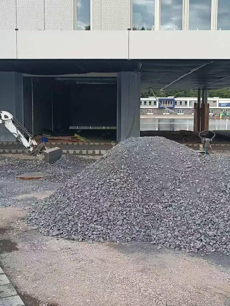 离开水球场地,步行大约5分钟就来到了赛艇场地附近。进入场地前,负责引路的工作人员提醒参观人员注意脚下砂砾,这段通往赛艇场地入口的200多米道路正在做路面硬化施工,路旁停着钩机,堆积着砂石。