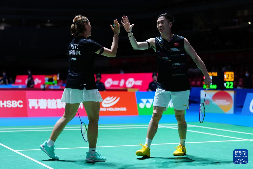 7月15日,邓俊文(右)/谢影雪在比赛后庆祝胜利。新华社记者 贾浩成 摄