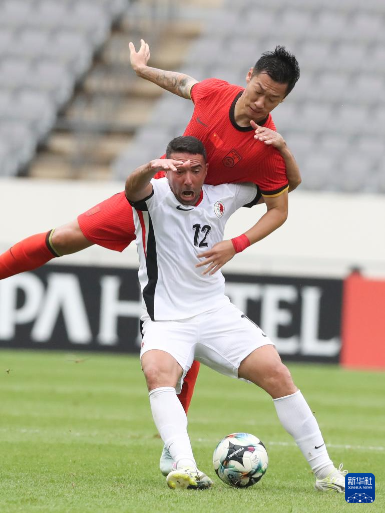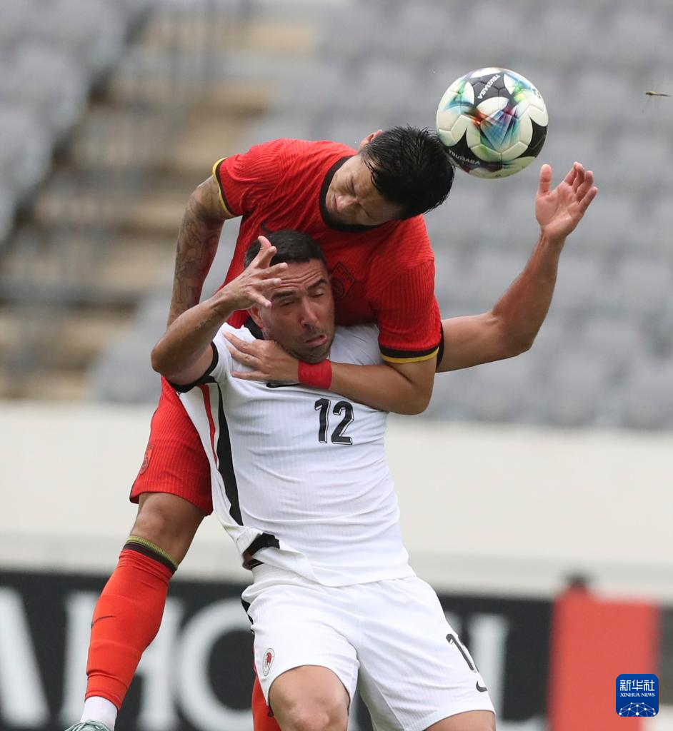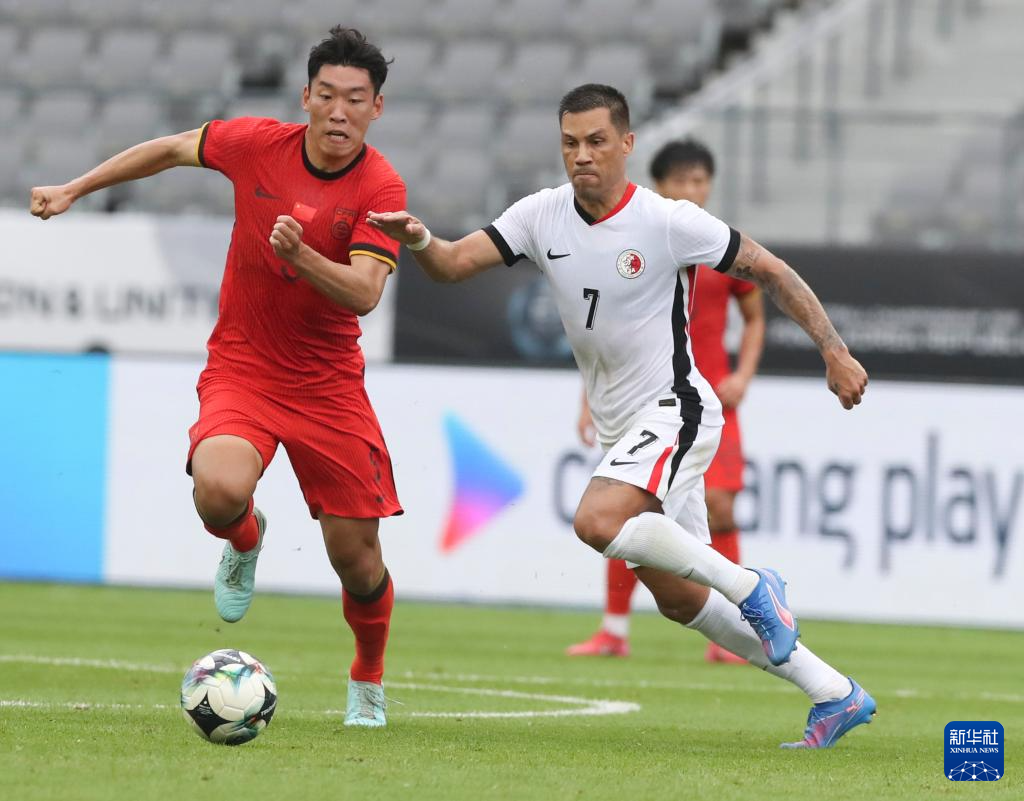 7月15日,中国队球员徐新(上)在比赛中与中国香港队球员费兰度在比赛中拼抢。新华社记者 姚琪琳 摄