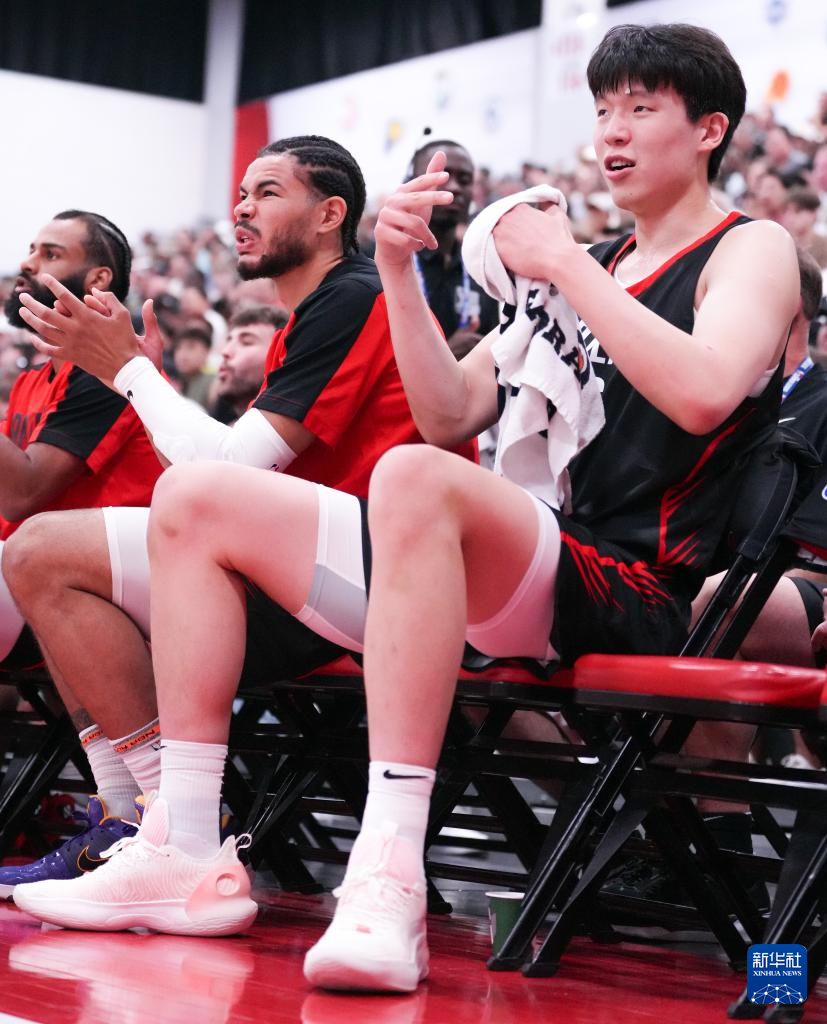 7月15日,开拓者球员杨瀚森(右)庆祝队友投进三分。新华社发(孙宇轩摄)