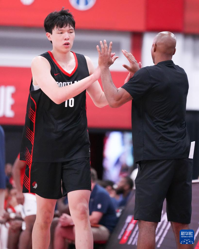 7月15日,开拓者球员杨瀚森(左)在比赛中跟教练击掌。新华社发(孙宇轩摄)