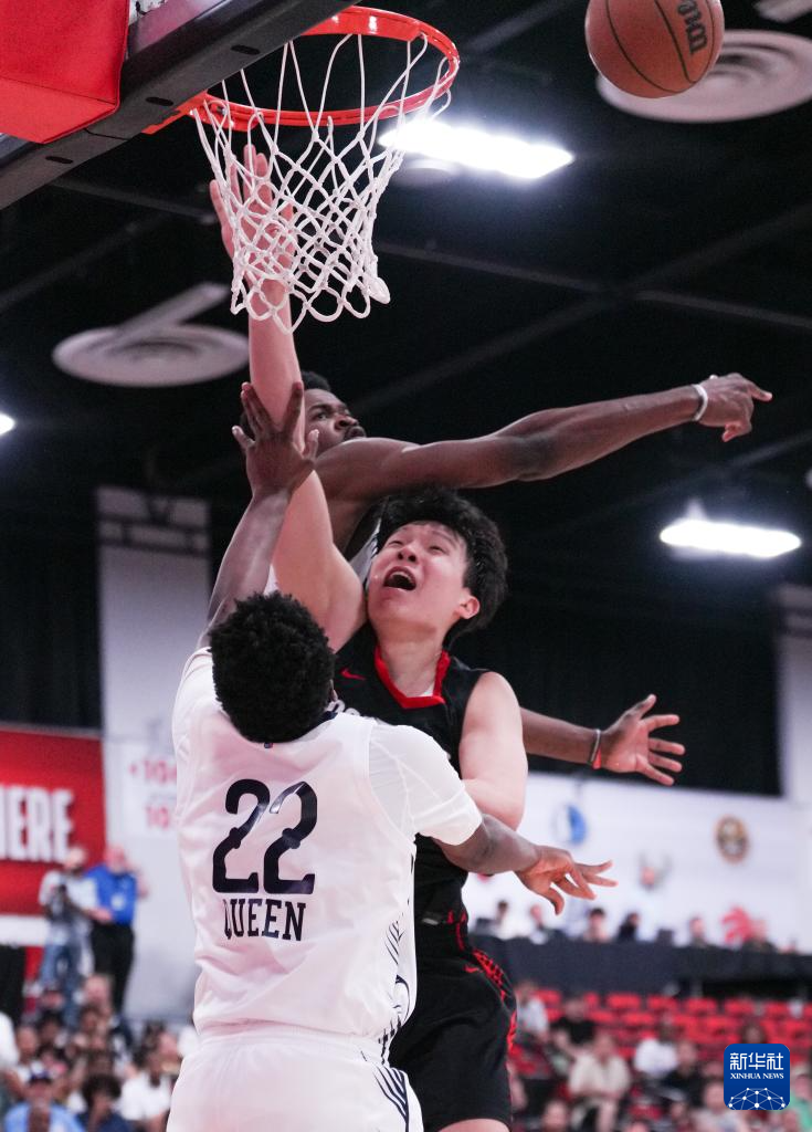 7月15日,开拓者球员杨瀚森(左)在比赛中争抢。新华社发(孙宇轩摄)
