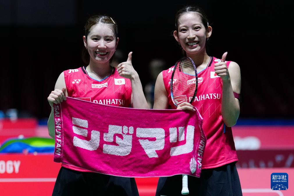 7月16日,松山奈未/志田千阳(左)在比赛后一起手举写有两人组合名的毛巾合影。新华社记者 贾浩成 摄