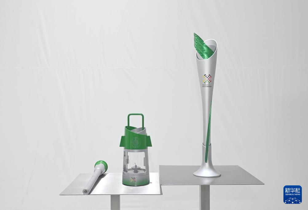 当日,成都世运会火炬传递系列装置(火炬“竹梦”、火种灯、采火棒、采火器、火种盆等)亮相。