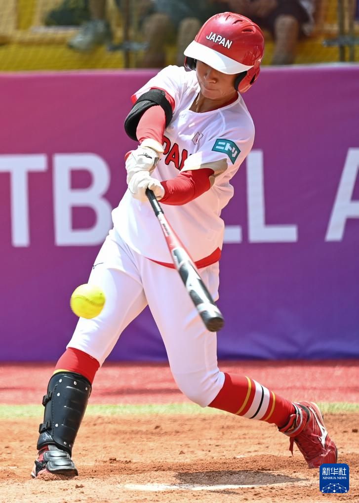 7月18日,日本队球员石川恭子在比赛中击球。新华社记者 邹竞一 摄