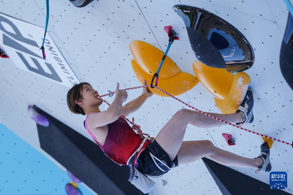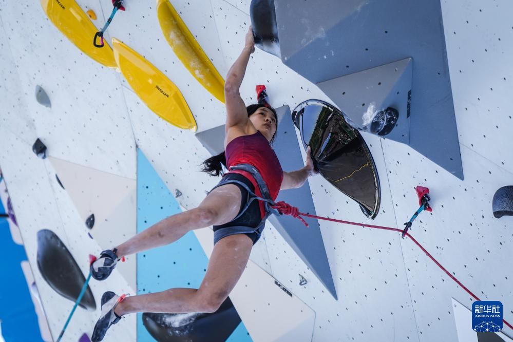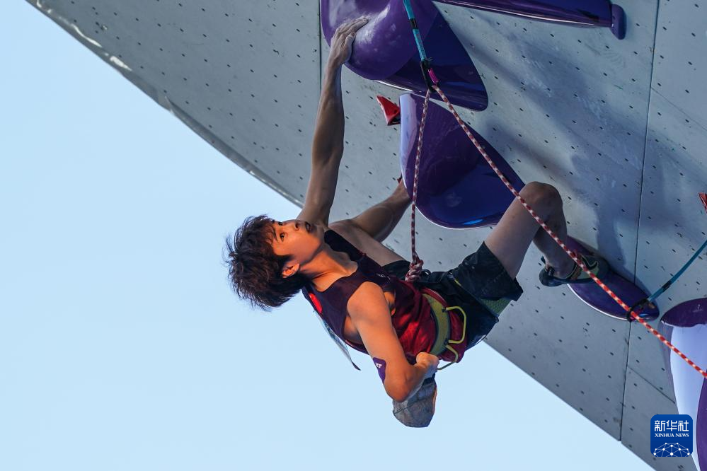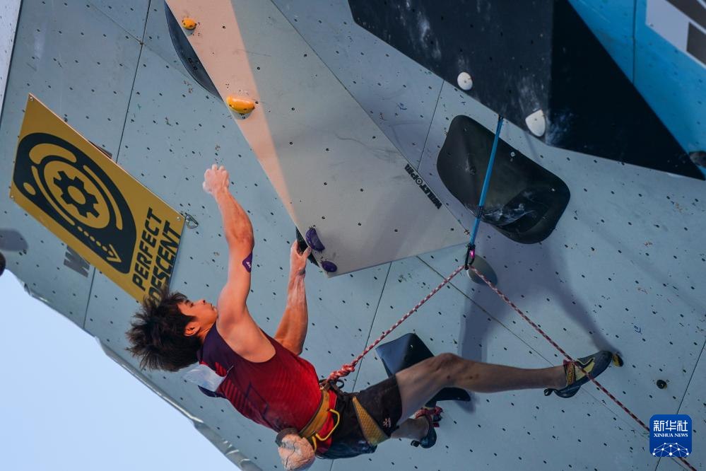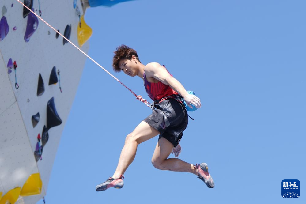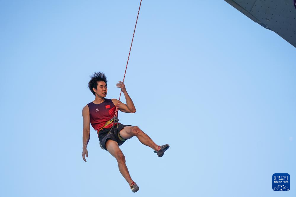 7月18日,中国选手潘愚非在男子难度半决赛前观察线路,最终他无缘决赛。新华社记者 彭子洋 摄