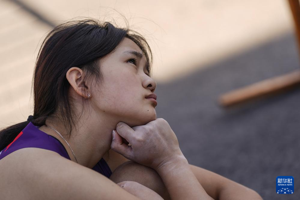 7月18日,中国选手韦雅丽在女子难度资格赛中观察对手比赛情况,最终她无缘半决赛。新华社记者 彭子洋 摄