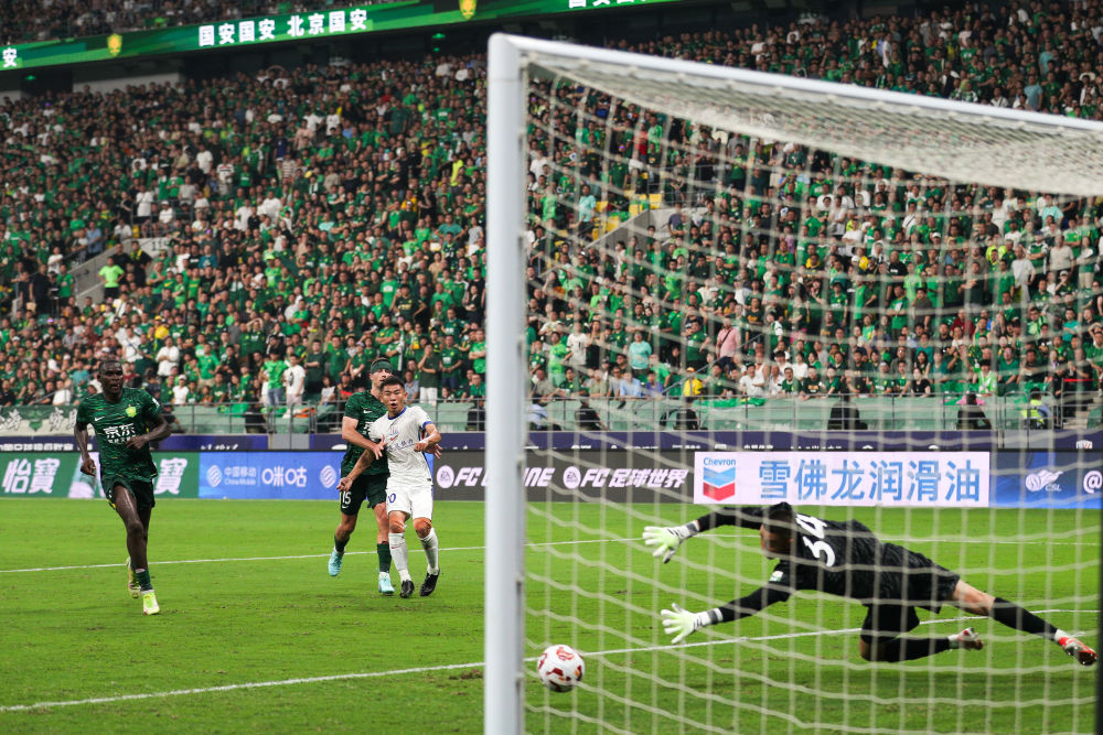 7月19日,北京国安队守门员侯森(下)未能成功扑出上海申花队球员于汉超的射门。新华社发(那宇奇摄)