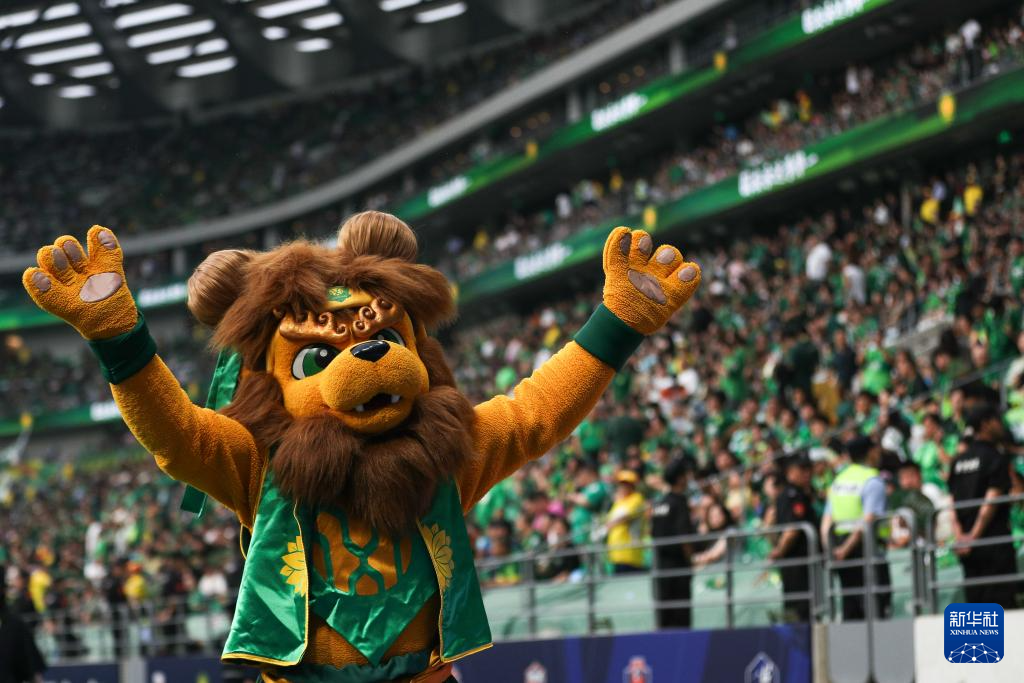7月19日,北京国安队吉祥物“金狮”在比赛前与观众互动,它装扮成与本场巨幅TIFO(可覆盖看台的大型横幅或拼图)相同的“哪吒”主题。