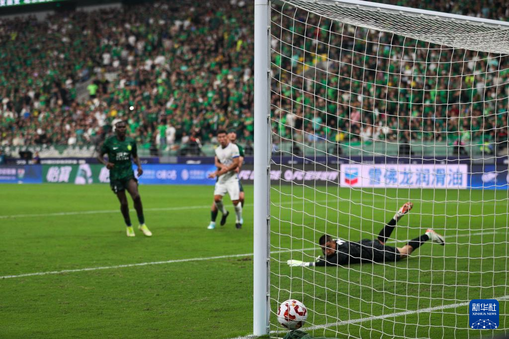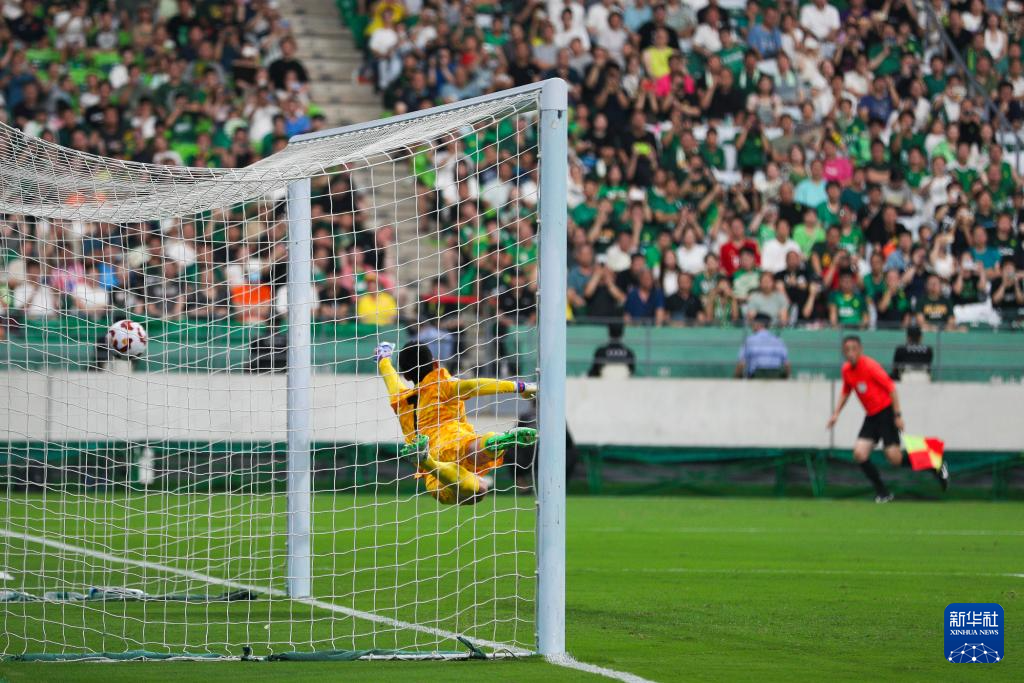 7月19日,北京国安队守门员侯森(中)在比赛中未能成功扑出上海申花队球员阿苏埃的射门。